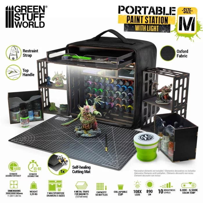 Scoprite la stazione di pittura portatile ultracompatta Green Stuff World, una stazione di pittura per hobby creativi leggera e pronta per viaggiare, progettata per pittori di miniature, modellisti e appassionati di artigianato che desiderano la massima organizzazione in uno spazio minimo. La sua base è ottimizzata per occupare solo 30 × 30 cm, ma si apre per formare una configurazione sorprendentemente completa, perfetta per uffici domestici, sessioni di pittura tra amici, corsi di artigianato ed eventi.